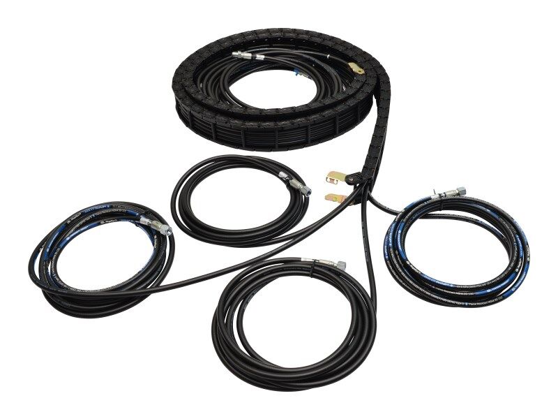 This hose and carrier boom assembly is suitable for JLG SkyTrak telehandler/rough terrain fork lifts and material handlers. Items included are the boom hose carrier, two tilt hoses, and two auxiliary hoses.